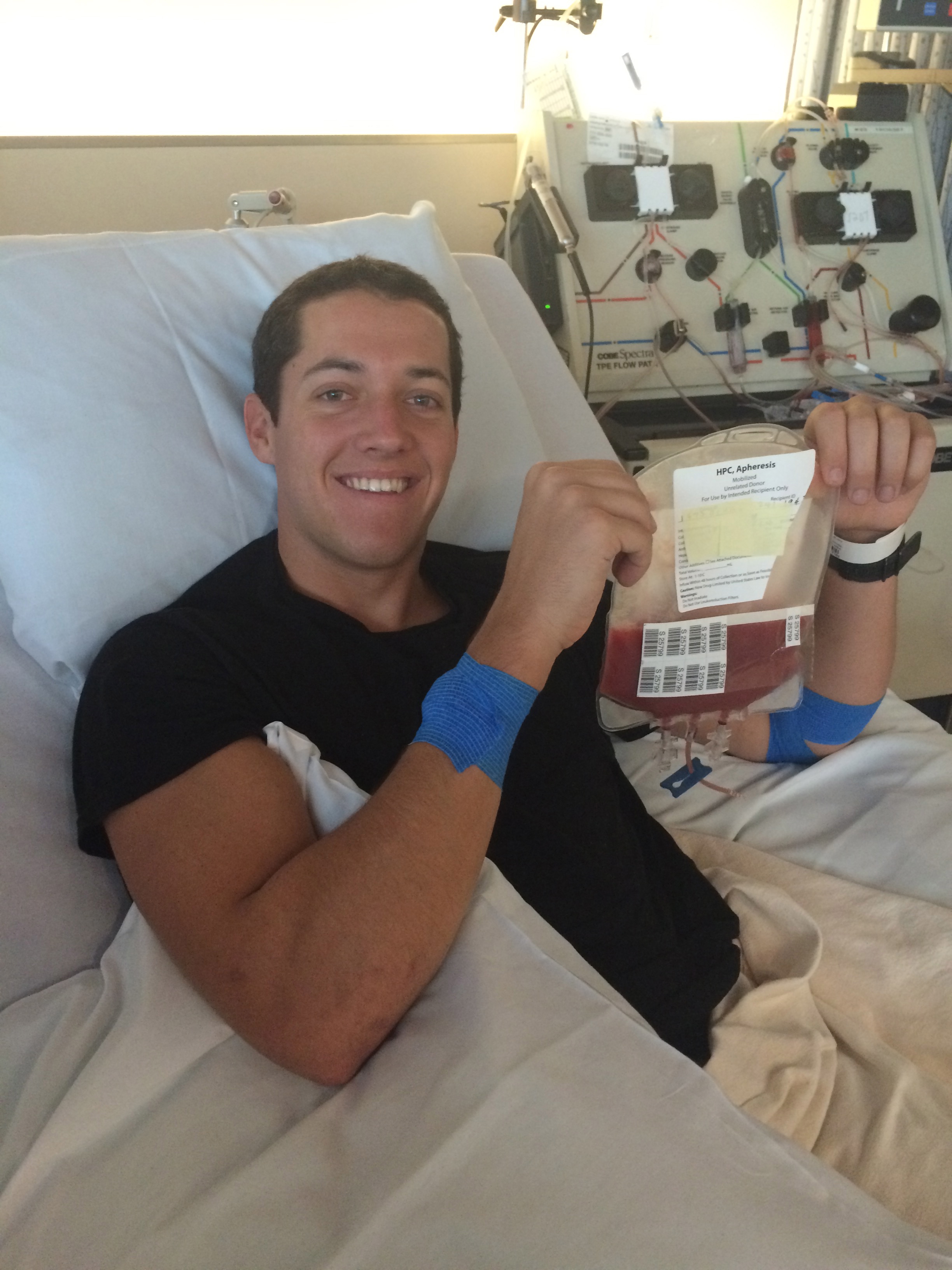 Rex achieved something I wish I could add to my list. He voluntarily saved a stranger’s life! Rex made his stem cell donation at City of Hope on November 18. For the five days leading up to this monumental day, he had Neupogen injections (3 per day) to move his stem cells from his bone marrow to his peripheral blood stream. He had to alternate needle placement from arms to legs, because of the soreness that set in. The drug made Rex feel nauseous, but he pushed through. A volunteer nurse met him at his fraternity annex, “Severance” or more affectionately known as “Sev” or more realistically known as a terrifying, yet lovable 3-storey pigsty/lean-to/hovel/shanty/rattrap just off USC’s Fraternity Row. I believe said nurse, bless her heart, showed up in full haz mat attire after the first visit scared the sh*t out of her. It’s hardly a place you would consider a good venue for sterile procedures to take place. If you saw the movie Animal House, then you are picturing something wayyyyyy tooooo posh and pristine. Regardless, Rex and the nurse survived the pre-donation shots and the big D day was upon us. We arrived at 7:30am and Rex was greeted by Monica, his wonderful Be The Match donor coordinator who had been guiding him through all of his preparation. He settled into his bed and was hooked up to a centrifuge via an IV in each arm. He was given his last two Neupogen injections and the mighty machine began to draw blood from his left arm, spin the stem cells out and deposit them in a plastic bag, then return his blood to his right arm. This went on for about 6 hours, until there were enough cells to transplant into the patient. From there, the bag was put on ice and couriered by a Be The Match volunteer to the patient’s hospital in Europe. Todd and I were by his side, as were good friend, Jared and his Uncle Leason, my brother and donor, which made it even more meaningful and special. While Rex was doing his life-saving at City of Hope, a reporter from The China Daily News came to interview him in an attempt to spread the word on needed donors in the Asian community. A CBS Channel 2 News crew was also scheduled to make a visit, but the producer suddenly changed the plan, and sent them to cover an explosion of some sort instead. Rule #83.7: Explosions trump stem cells. Up until this point, we had only heard that the mystery patient was a 65-year-old man living outside the United States. That day we learned that he was in Italy. We are hoping to get an update on his prognosis, and we hope to be able to meet him someday, although the transplant laws in Italy are quite restricting on donor/patient contact. Rex also agreed to participate in a special City of Hope stem cell research study by donating his stem cells that were left in all the tubing. I am beyond proud of Rex for following through on his donation and literally giving himself to a stranger in an attempt to save the life of this likely husband/father/grandfather/brother/son/uncle/friend!