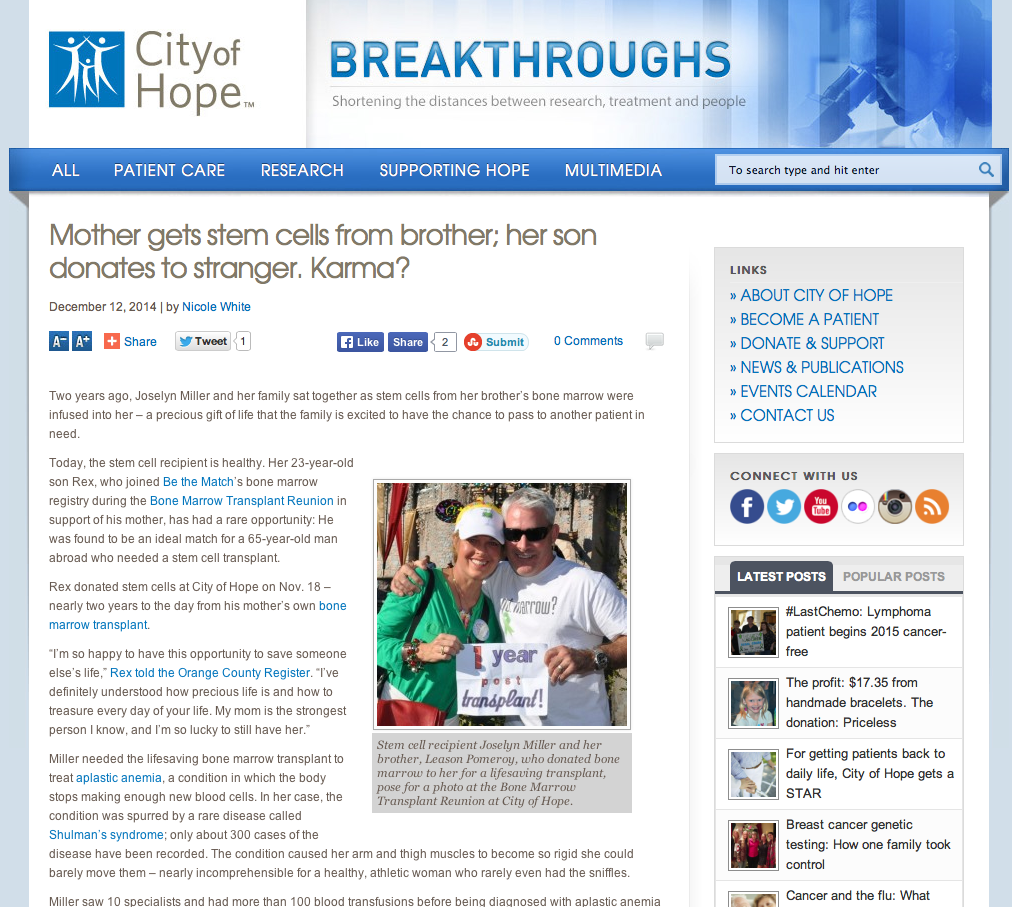 City of Hope posted our story on December 12: http://breakthroughs.cityofhope.org/stem-cell-recipient-joselyn-miller