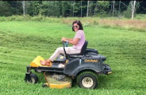 √ 14. Make a cool pattern on a giant lawn with a ride-on mower – Driving down a country lane in Western New York, we came around a corner and there was a woman mowing her lawn with a ride-on mower. Todd says, “You gotta go ask her if you can try it!” I was like, “She’ll think I’m a freak.” He turns the rental car around and pulls up into her driveway. I get out and start walking across her huge lawn, waving at her. She stops the mower and I tell her about my Buttkick List. She says, “Jump on!”